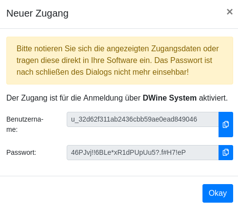 WICHTIG: Die nun angezeigten Zugangsdaten werden nur jetzt einmal angezeigt!